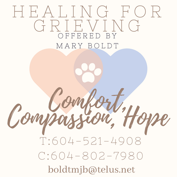 If you need someone to speak to we highly recommend Mary Boldt. What she will do is journey with anyone who is going through any type of a loss and can’t seem to get past the hurdle of moving on. As a person who has experienced pet loss first hand she is a wonderful resource for transitioning through this difficult time.
